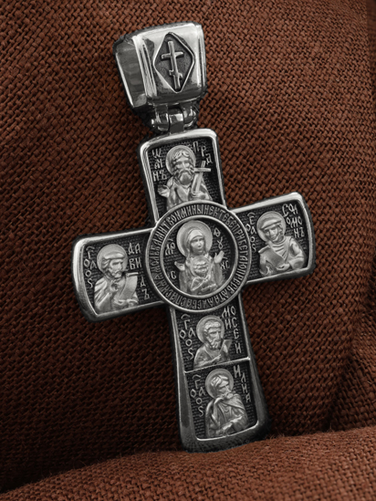Центральную часть оборота креста украшает икона Божией Матери «Знамение». Вокруг Ее образа написана молитва: «Ныне к Тебе прибегаю, Пресвятая Дева, спаси мя мольбами Твоими».