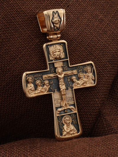 На лицевой стороне креста изображено Распятие Господа Иисуса Христа с предстоящими Ему святыми, которые, по преданию, находились у Креста Господа во время Его казни. Слева — Пресвятая Богородица и жены-мироносицы — равноапостольная Мария Магдалина и святая Мария Клеопова, справа — апостол Иоанн Богослов, прав. Иосиф Аримофейский и мч. Лонгин Сотник.