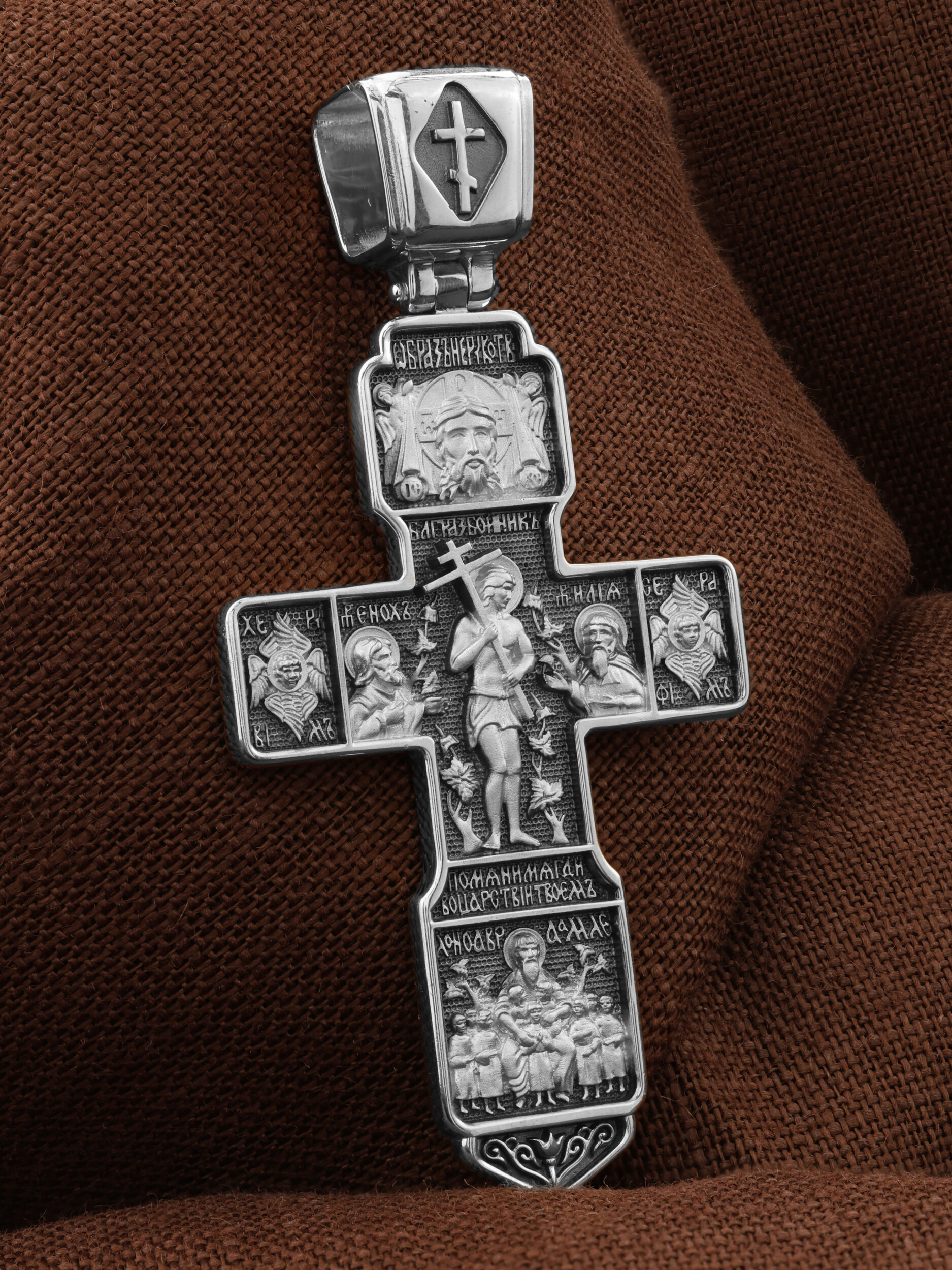 На концах горизонтальной балки креста помещены образы вселенских святителей и творцов литургии Василия Великого и Иоанна Златоуста. В кулонном кольце изображены райские врата с их стражем — Херувимом. Врата, которые открылись благодаря крестной жертве Христа.