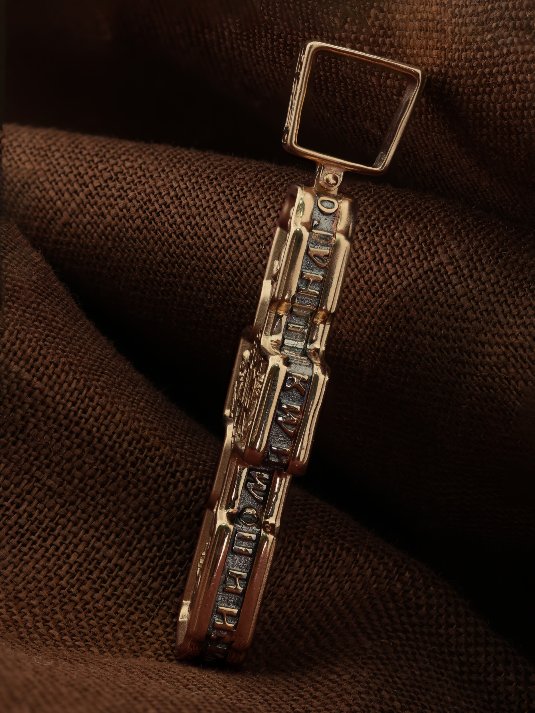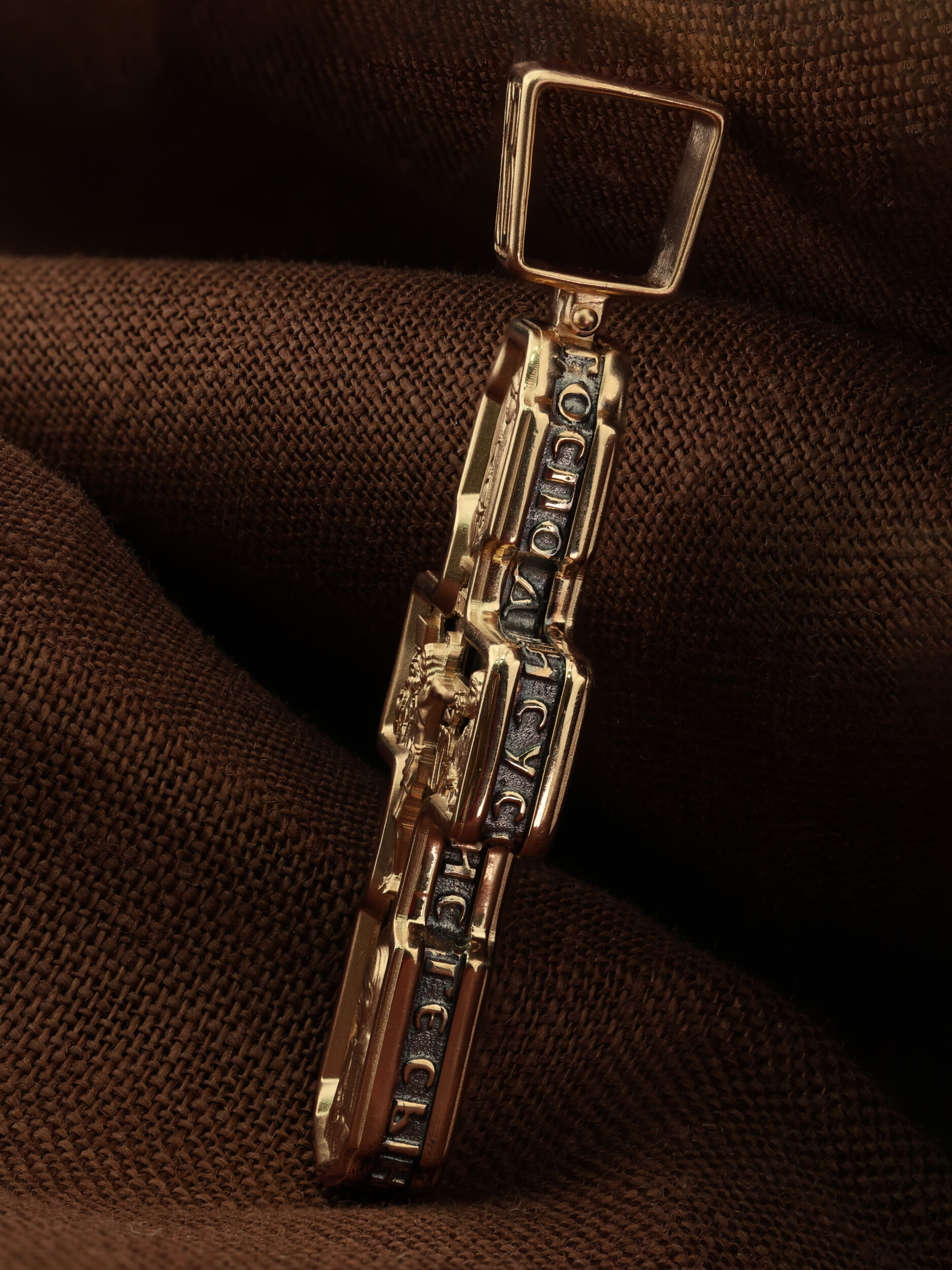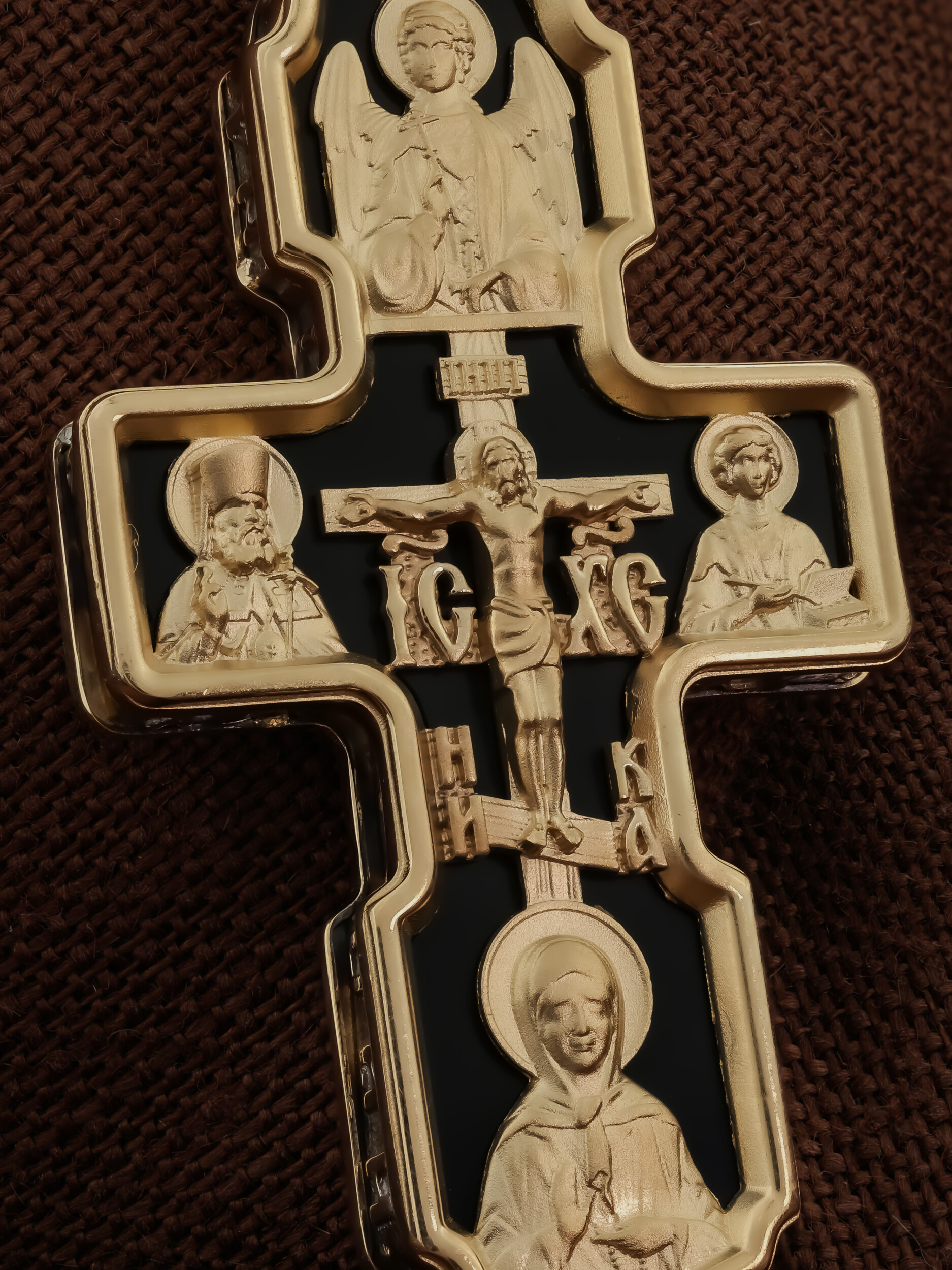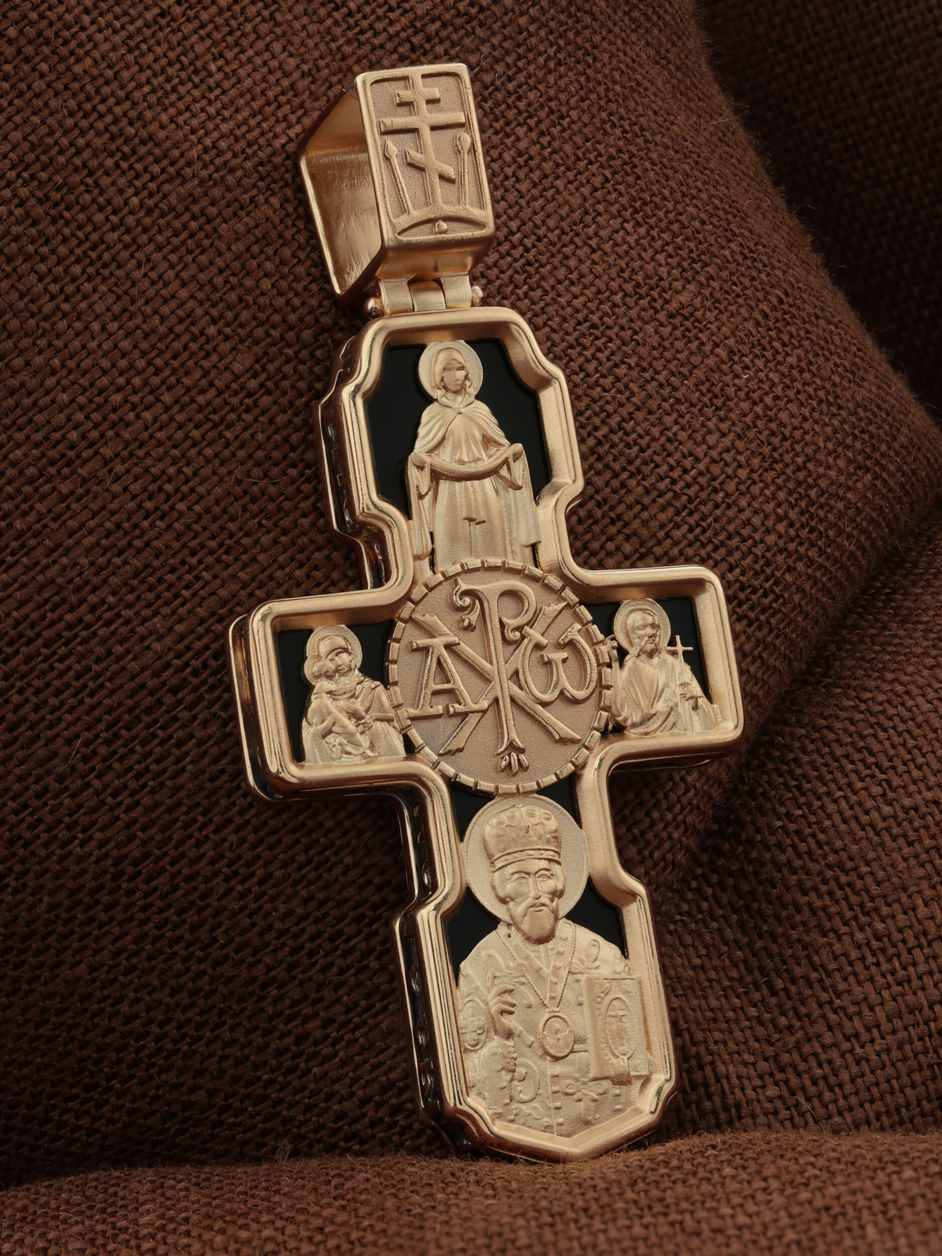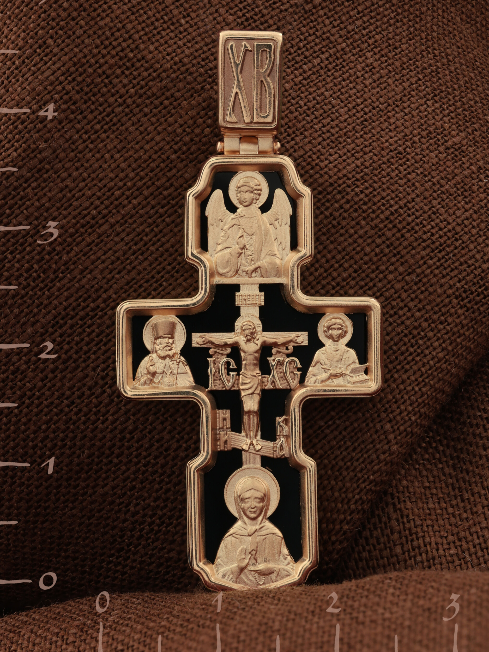 На лицевой стороне креста изображено Распятие Господа и Спасителя нашего Иисуса Христа. Христос, подвергнутый на кресте мучительной казни, своими страданиями искупил нас от древнего греха и даровал нам жизнь вечную. Без Распятия не было бы Воскресения Христова, и поэтому Крест из орудия казни обратился в святыню, в которой действует Благодать Божия. На верхней табличке, выше головы Иисуса, расположена надпись, составленная Понтием Пилатом на трех языках — «IНЦI». Она означает «Иисус Назорей, Царь Иудейский». Надпись «IС ХС» означает Иисус Христос и помещается на разных сторонах поперечной (большой) перекладины креста. На нижней перекладине находится надпись –«НИКА», что означает победитель. Над Распятием изображен Святой Ангел-Хранитель держащий крест в правой руке. Ниже Распятия — образ Святой блаженной старицы Матроны Московской. Справа — образ Свя¬того ве¬ли¬ко-му¬че¬ника и це¬ли¬теля Пан¬те¬ле¬и¬мона, а слева — образ Святителя Луки (Войно-Ясенецкого). На кулонном кольце находится надпись «ХВ», что означает Христос Воскрес. На торцевой стороне креста размещены слова Иисусовой молитвы: «Господи Иисусе Христе, Сыне Божий, помилуй мя, грешного».