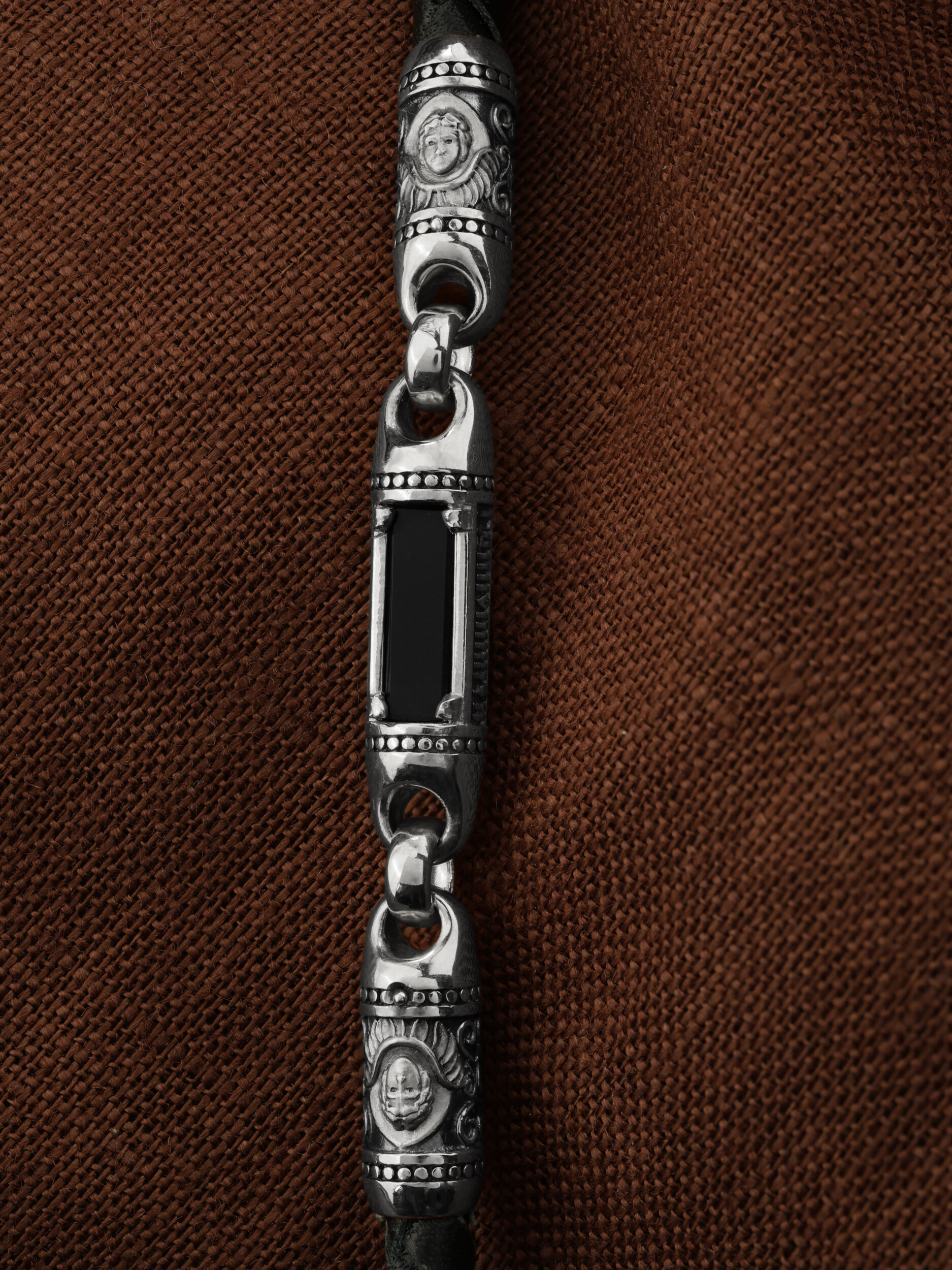 Гайтан из белого золота c кожаным шнурком и ониксом