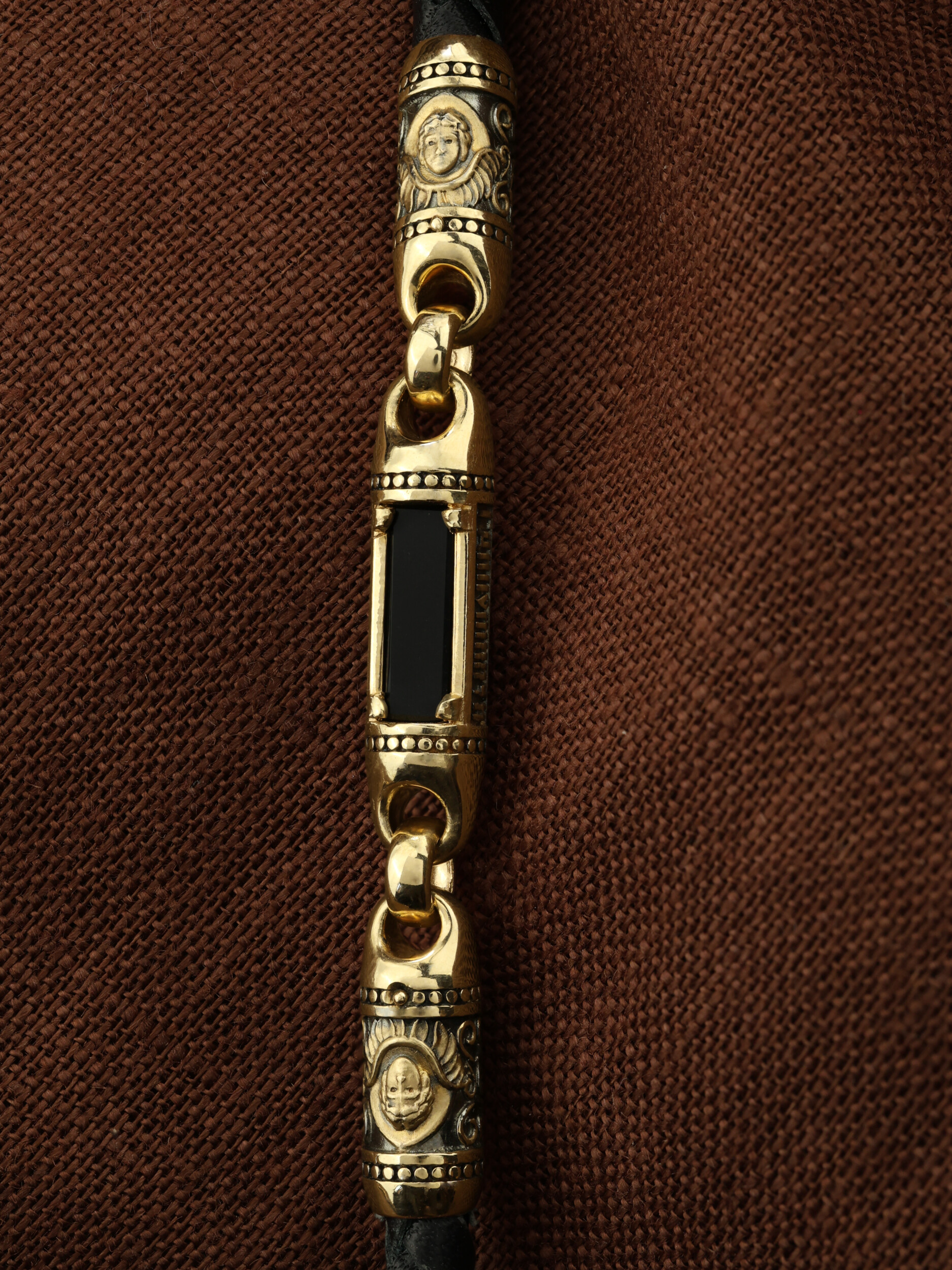 Гайтан из лимонного золота c кожаным шнурком и ониксом