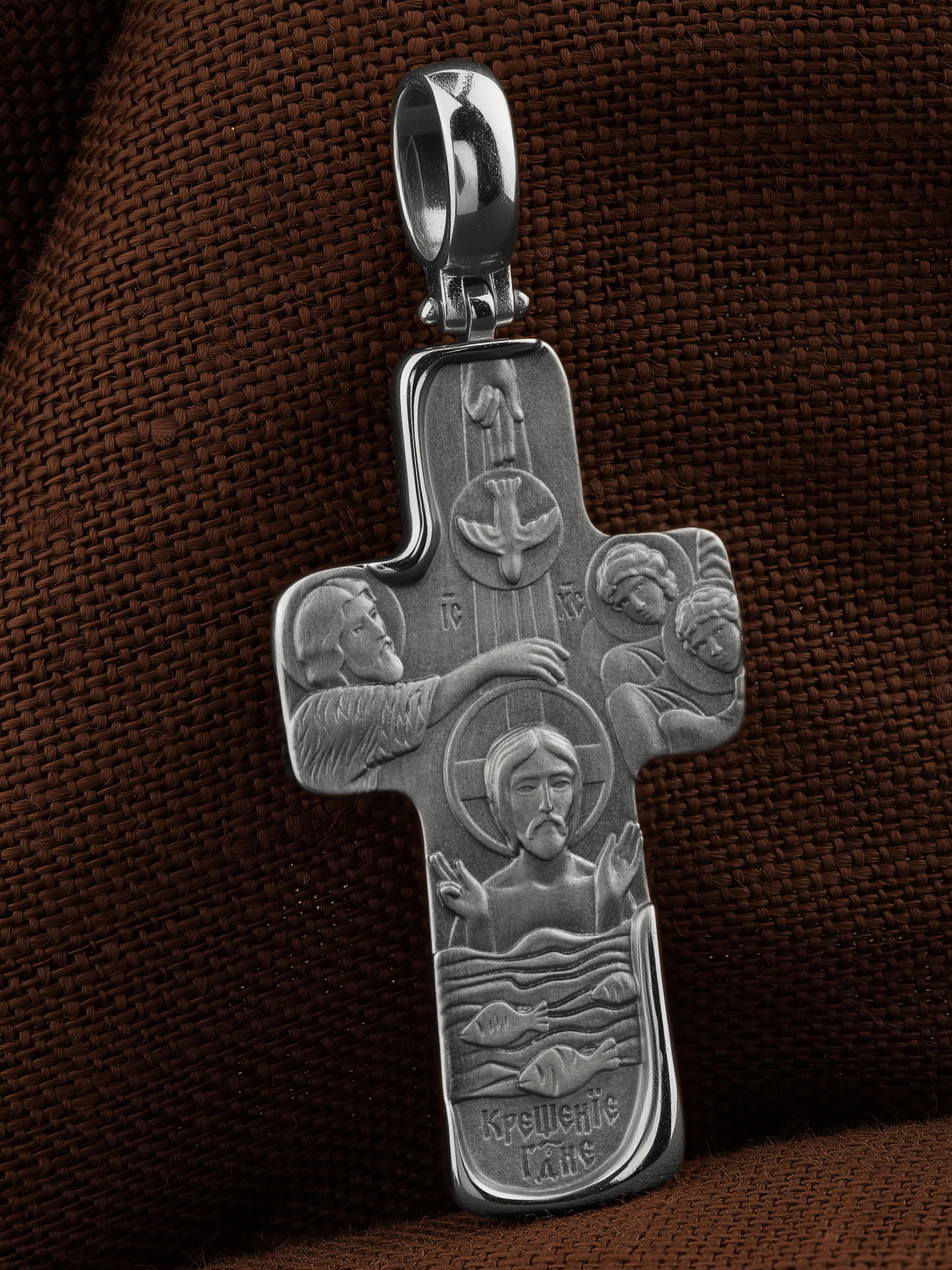 На оборотной стороне креста изображено «Крещение Господне». В образе запечатлено не только Крещение Спасителя во Иордане от Иоанна Предтечи, но, прежде всего, явление миру воплотившегося Сына Божия как Одного из Лиц Святой Троицы, о Котором свидетельствуют благословляющий десницей Отец и Святой Дух, сошедший на Христа в виде голубя. Справа изображены ангелы, склонившиеся ко Христу и, подобно восприемникам от купели, держащие покровы на руках.