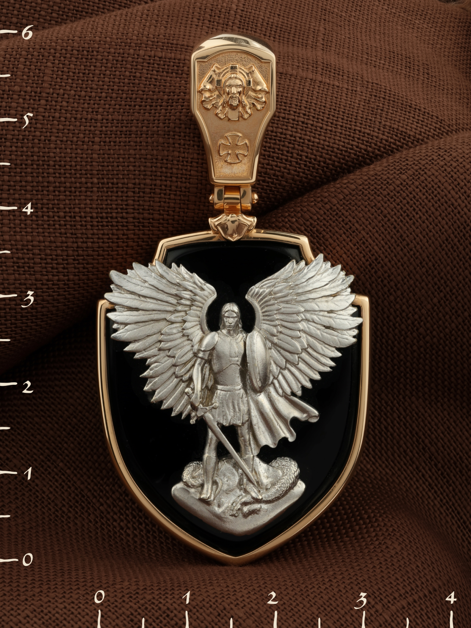 На лицевой стороне образка размещено изображение Архангела Михаила — верного служителя Божия, который низринул с Неба возгордившегося денницу с другими павшими духами. В Православии его называют Архистратигом, что означает глава святого воинства Ангелов и Архангелов. Образок сделан в виде воинского щита. Архангел Михаил изображен в воинственном виде с огненным мечом в правой руке и щитом в левой поражающим змея. Змей символизирует собою сатанинские силы. Архангел почитается, как покровитель воинов и всех верных Богу и ведущих борьбу против сил зла, борец против ересей, а также защитник душ умерших, страж райских врат. С древних времен прославлен своими чудесами Архангел Михаил на Руси. Примеров явления и помощи Архистратига Михаила в русской истории бессчетно. Архангел Михаил не перестает ратоборствовать за славу Творца и Господа всяческих, за дело спасения рода человеческого, за церковь и чад ее. И, согласно, Откровению Иоанна Богослова во время последней битвы небесных и дьявольских сил Михаил и его ангелы опять низвергнут люцифера вместе с его войском: «Михаил и Ангелы его воевали против дракона, и дракон и ангелы его воевали [против них], но не устояли, и не нашлось уже для них места на небе. И низвержен был великий дракон, древний змий, называемый диаволом и сатаною, обольщающий всю вселенную, низвержен на землю, и ангелы его низвержены с ним» (Откр.12:7−9). На кулонном кольце изображен Нерукотворный образ Господа и Спасителя нашего Иисуса Христа, чудесно отпечатавшийся на плате, которым Христос вытер свой лик.