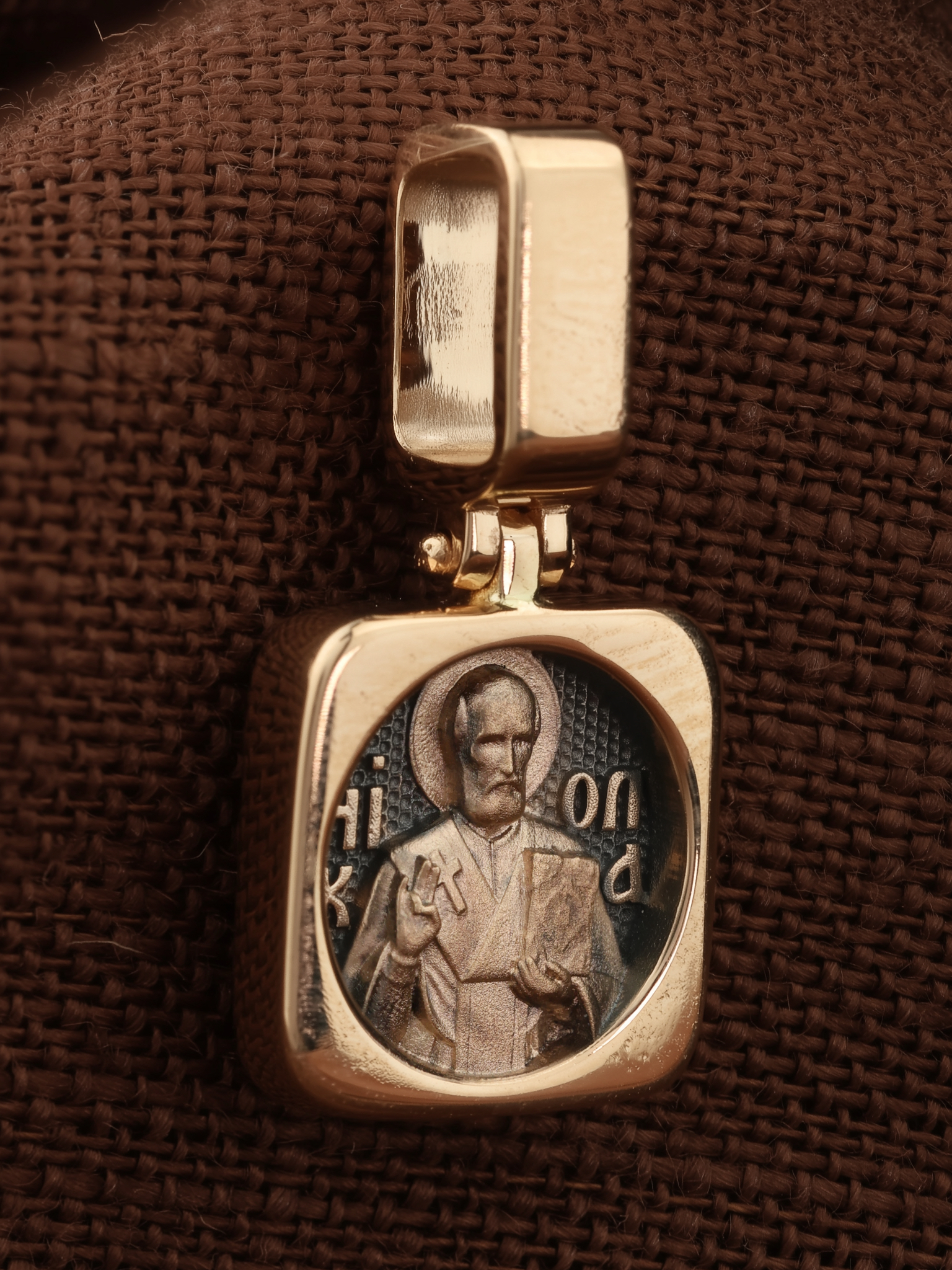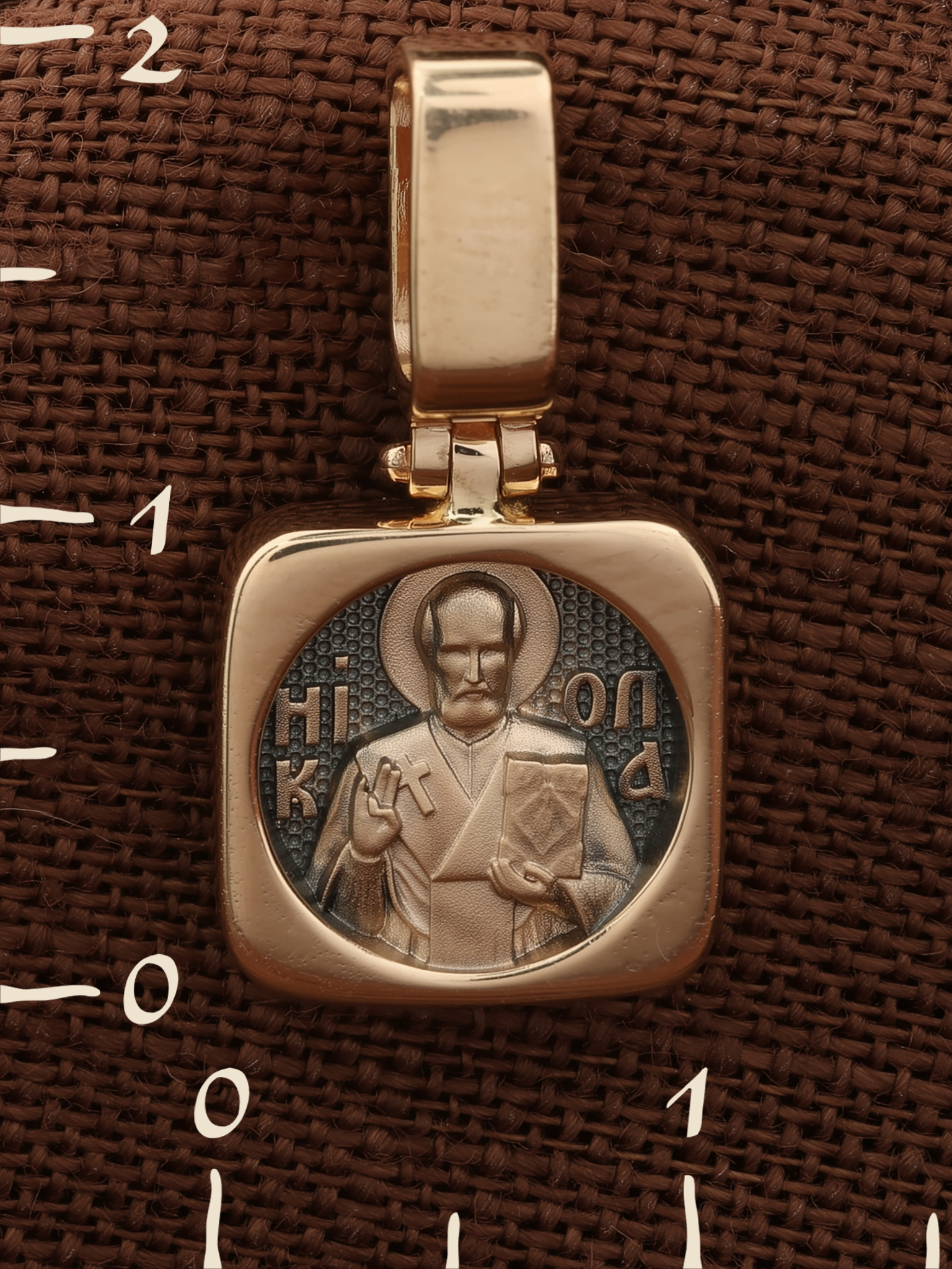 На лицевой стороне образка изображен Святитель Николай архиепископ Мир Ликийских, Чудотворец. Он является одним из самых почитаемых святых в православном мире. Святитель Николай родился во второй половине III века в Малой Азии в Ликийском городе Патары. С рождения Божий Угодник проявлял необыкновенные дарования. Сохранилось Предание, что во время крещения он, никем не поддерживаемый, простоял в купели три часа. Приняв сан священника, святитель Николай стал проводить еще более строгую подвижническую жизнь. Избранник Божий Николай стал вершиной всех добродетелей, поднятой до райской высоты. С кем из величайших праведников не сравнялся он образом духовной красоты, кому из них не последовал в своих деяниях и чудотворениях? Вся жизнь святого Николая — это служение Богу. Много великих и преславных чудес сотворил великий Святитель Николай Угодник. Он помогал сущим в бедах, укрощал штормы, спасал от потопления и выносил на сушу из глубины морской, освобождал из плена и приносил освобожденных домой, избавлял от уз и темницы, защищал от посечения мечом, освобождал от смерти и подавал многим различные исцеления: слепым — прозрение, хромым — хождение, глухим — слух, немым — дар слова.